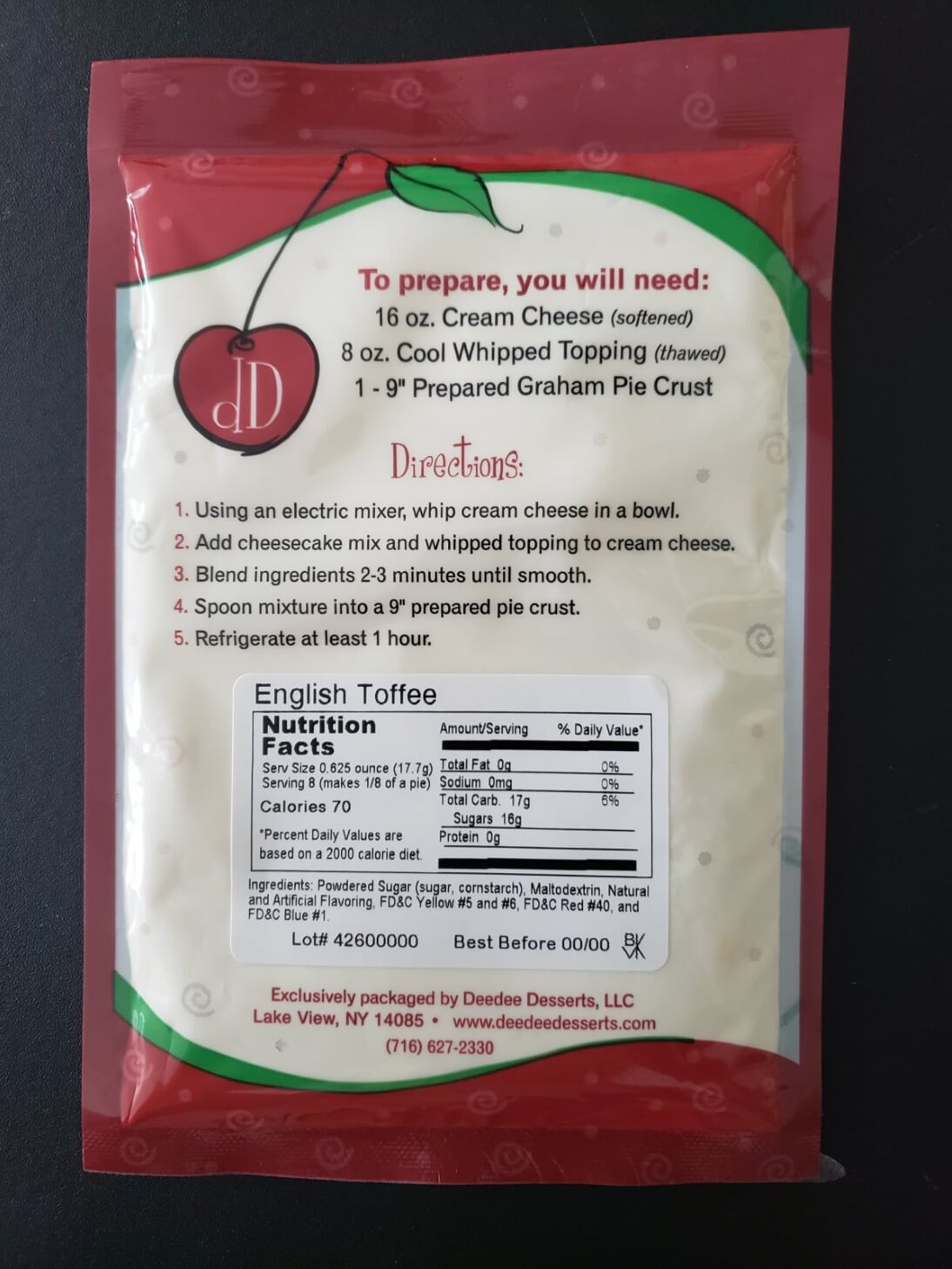 English Toffee Cheesecake Mix$6.00 A delicate taste of caramelized brown sugar combined with butter and a dash of vanilla. Simply delicious! Out of stock Category: Cheesecake Mixes Related products Pistachio Cheesecake Mix $6.00 Add to Cart A Pistachio flavor that will catapult you to a new level. Amazing! *Made with artificial pistachio flavoring. More... Spiced Pumpkin Cheesecake Mix $6.00 Add to Cart A precise blend of cinnamon and ginger combined with the phenomenal flavor of pumpkin makes this cheesecake a perfect ending to any meal or get-together! More... Lemon Chiffon Cheesecake Mix $6.00 Add to Cart If lemon is what you love, you will enjoy the light and airy flavor of our Lemon Chiffon Cheesecake Mix. A refreshing way to end any meal! More...