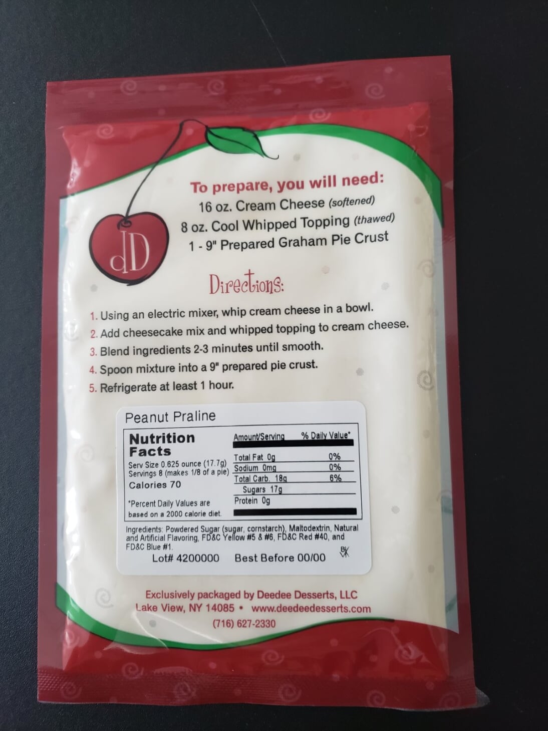 Peanut Praline Cheesecake Mix$6.00 A peanut lovers dream… a unique blend of peanuts, butter, caramel, and vanilla makes this Cheesecake mix a step above the rest. *Made with artificial peanut flavoring. Peanut Praline Cheesecake Mix quantity Add to cart Category: Cheesecake Mixes Related products Peanut Butter Pie $6.00 Add to Cart You asked...We listened! Be sure to try our New Peanut Butter Pie. *Made with artificial peanut flavoring. More... Banana Foster Cheesecake Mix $6.00 Add to Cart Our Banana Foster cheesecake starts with the flavors of ripened bananas topped with brown sugar, cinnamon and vanilla and then smothered in a Buttery Rum Sauce. Absolutely Delicious! More... Pistachio Cheesecake Mix $6.00 Add to Cart A Pistachio flavor that will catapult you to a new level. Amazing! *Made with artificial pistachio flavoring. More...